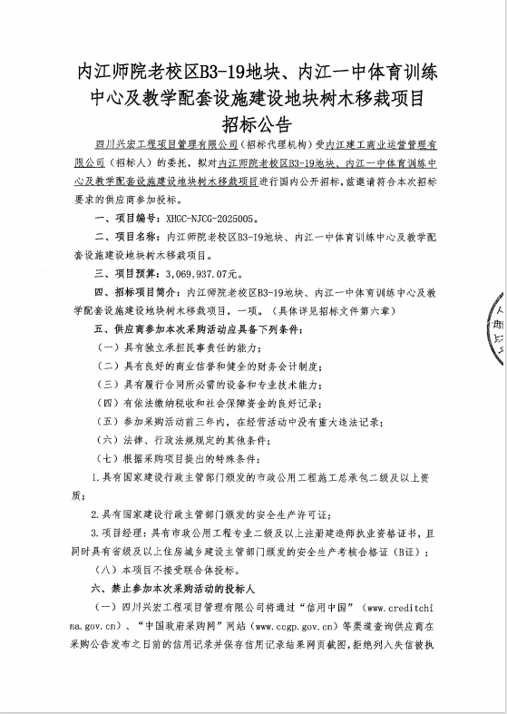 內(nèi)江師院老校區(qū)B3-19地塊、內(nèi)江一中體育訓(xùn)練中心及教學(xué)配套設(shè)施建設(shè)地塊樹(shù)木移栽項(xiàng)目招標(biāo)公告
