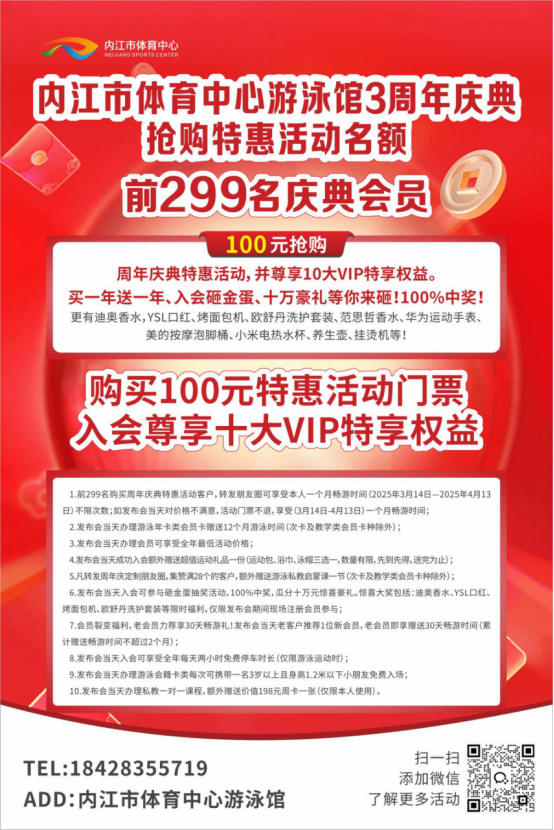 內(nèi)江市體育中心游泳館3周年慶典大型特惠活動火熱進(jìn)行中,前299名100元購買特惠活動并尊享10大VIP特權(quán),買一年贈送一年、 入會砸金蛋 、 十萬豪禮等你來拿!100%中獎!更有迪奧香水、YSL口紅、歐舒丹洗護(hù)套裝、華為運(yùn)動手表、小米電熱水杯、范思哲香水、美的按摩泡腳桶等等,并享受全年最低活動價,還可暢游1個月,本次活動推出了游泳年卡、游泳次卡、私教一對一課程、長訓(xùn)班、兒童蛙泳暑假班、兒童自由泳暑假班等。